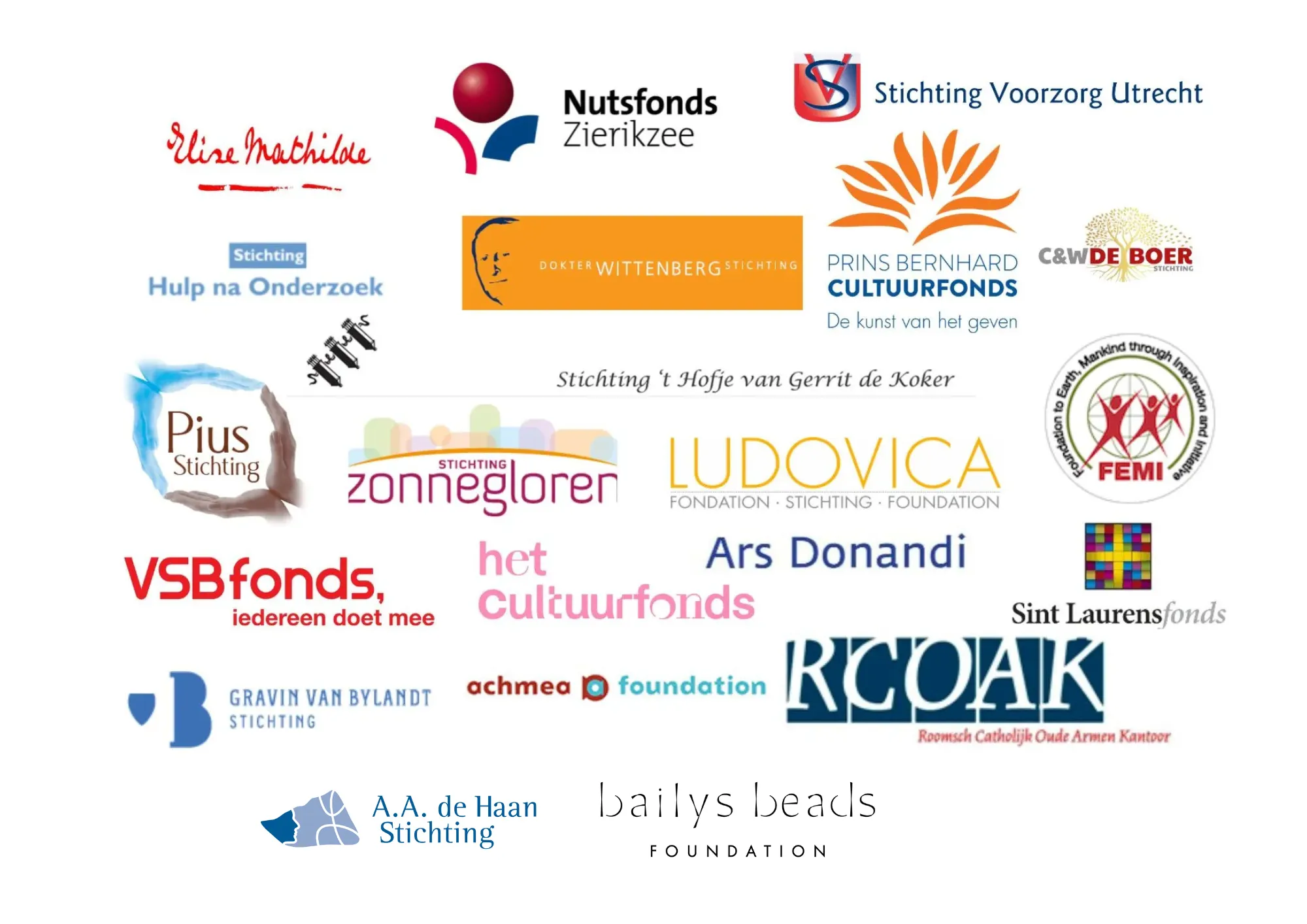 Nutsfonds Zierikzee • Stichting Zonnegloren • Sociaal-cultureel fonds De Amersfoortse • Elise Mathilde stichting  • Ars Donandi - Russell-ter Brugge fonds  • Fonds Sluyterman van Loo • RCOAK • LVC (Landelijke Vereniging van Crematoria) – Dr. C.J. Vaillant Fonds • KNR (Konferentie Nederlandse Religieuzen) – Projecten in Nederland (PIN) • Sint Laurensfonds • Stichting N. van Ballegooijen Fonds • Bavo Stichting • Gravin van Bylandt Stichting • het Cultuurfonds (Piet Boxem Fonds en het Madelief  Fonds) • Stichting Voorzorg Utrecht • C&W de Boer Stichting • A.A. De Haan Stichting • Bailys Beads Foundation • Anonieme fondsen